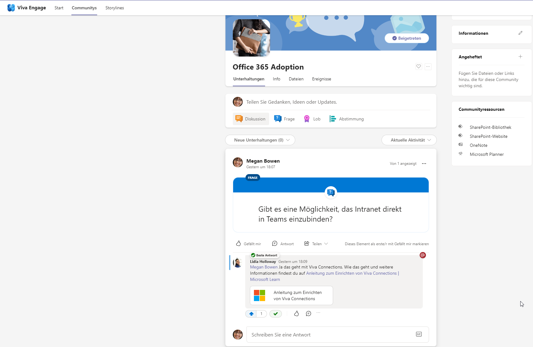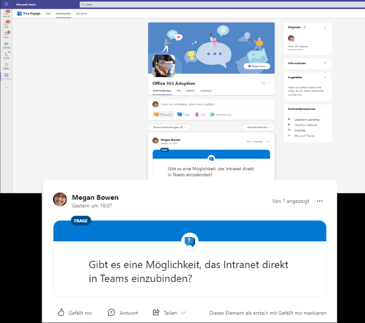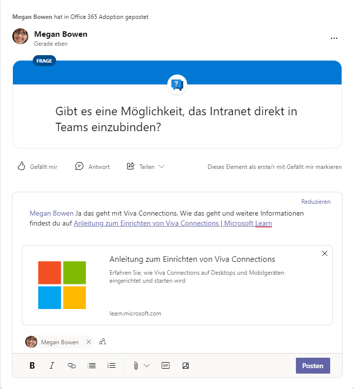 Dadurch hat man in Viva Engage analoge Möglichkeiten, wie dies in Internetforen häufig der Fall ist.