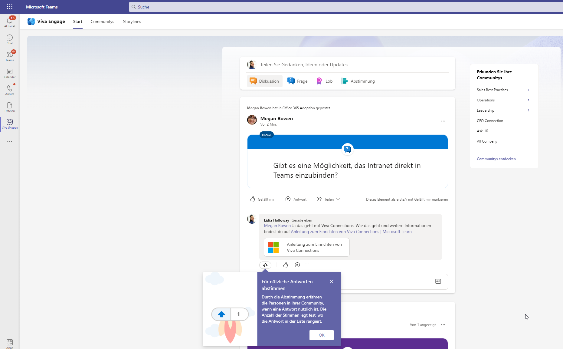 Viva Engage liefert dir als lesende Person in der Community eine Antwort als nützliche Antwort zu markieren. Dies ist eine Art Ranking, wobei die Abstimmungen aufsummiert werden.