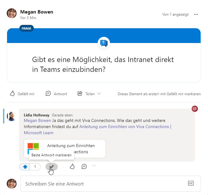 Wenn man in Microsoft Viva Engage einen Post als Frage erfasst, dann können da schnell viele Antwortmöglichkeiten oder gar Diskussionen entstehen. Dabei ist es sowohl für die Autoren, als auch für die Lesenden schwierig die Übersicht zu behalten. Aus diesem Grund kann man in der Community Antworten spezifisch markieren.