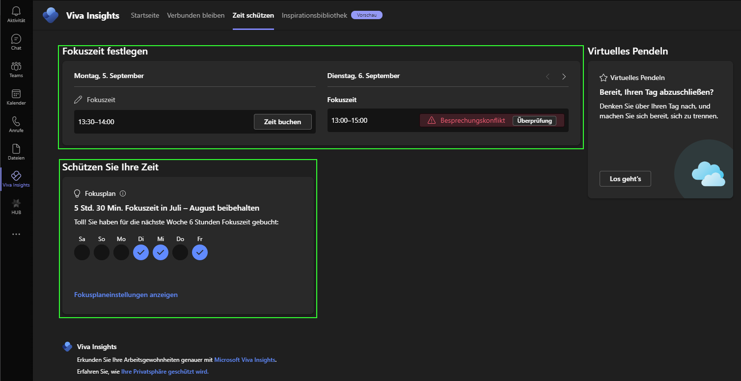 4. Im Tab ‚Zeit schützen‘ findest du nun alle relevanten Informationen und Möglichkeiten rund um deine Fokuszeit. So gibt die Viva Insights im Kapitel ‚Fokuszeit festlegen‘ direkte Vorschläge, wann du einen Zeitslot hast der passt. Ebenfalls informiert dich Viva Insights über allfällige Besprechungskonflikte.