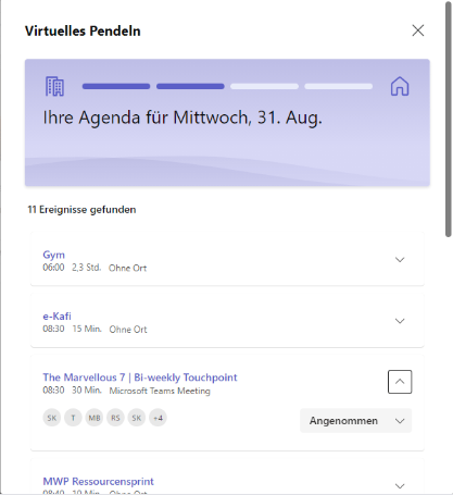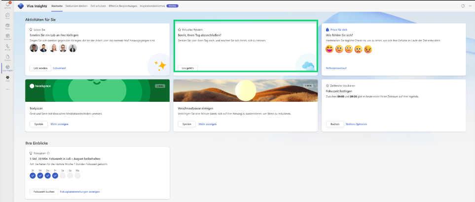 Microsoft hat diese Problem erkannt und wie so häufig wird beim Tech-Giganten, vor allem auch grossen Wert auf das Wohlbefinden gesetzt. Was könnte da besser passen als Viva Insight. Das Tool, welches ohnehin für die verbesserte Produktivität und höheres Wohlbefinden steht. In eurem persönlichen Viva Insights App in Teams, gibt es die Funktion «virtual commute» (Dt.: virtuelles Pendeln). Dabei wird der Prozess des Pendelns simuliert und ihr könnt euren Tag effektiv zu einem Abschluss bringen.