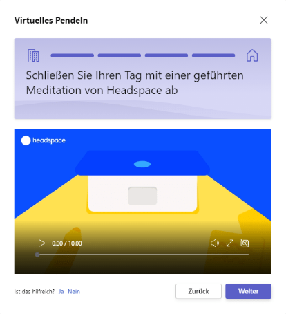 4. Nun startet das virtuelle Pendeln direkt in Teams in mehreren Schritte. Beginnend von ‚Vorgeschlagenen Aufgaben von Outlook‘, über die Agenda des Folgetages prüfen hin zu einer Meditation von Headspace.