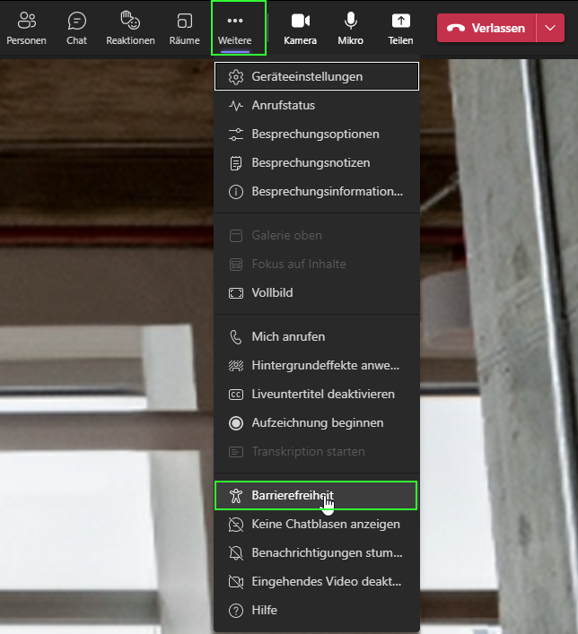 2. Nun hast du zwei Optionen, um die Untertitel zu aktivieren. Gehe auf «… Weitere» und anschliessend auf «Barrierefreiheit». Anschliessend kannst du die Option «Liveuntertitel» aktivieren.