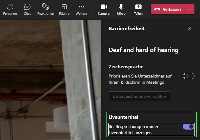 Hinweis: du kannst ebenfalls die Funktion «Zeichensprache» aktivieren, falls jemand das Gesprochene in die Zeichensprache übersetzt.