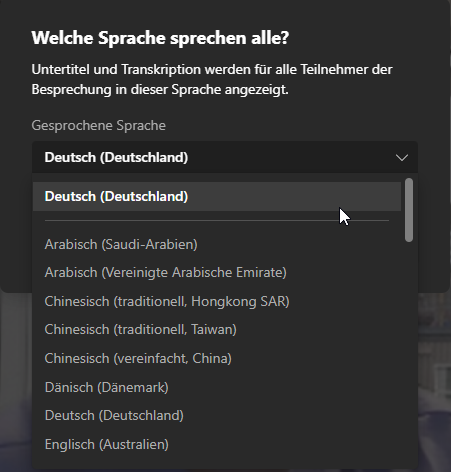 3. danach erscheint ein Fenster, in welchem du die gesprochene Sprache auswählen kannst. Wenn das Meeting bspw. in Deutsch gehalten wird, wählst du hier entsprehcend Deutsch aus.