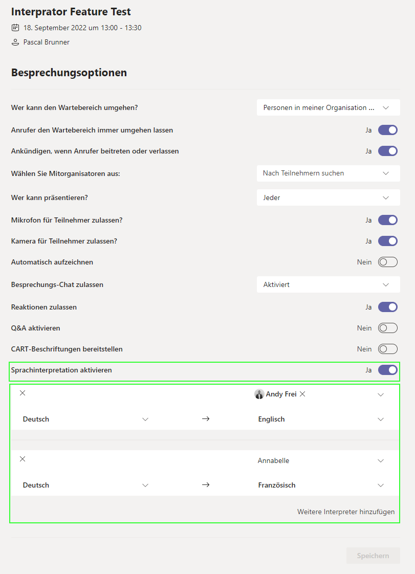 3. Es öffnet sich der Browser, in welchem du die Besprechungsoptionen anpassen kannst. Hierbei musst du zuerst Feature Sprachinterpretation aktivieren. Danach kannst du einen Interpreter auswählen (eine eingeladene Person im Meeting) und die zu übersetzende Sprachpaare. Beispielsweise wie im nachfolgenden Bild wird Andy Frei das gesprochene in Deutsch auf Englisch übersetzen.