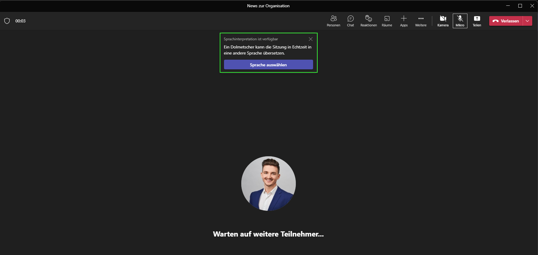 4. Wenn nun Personen das Meeting betreten, erhalten sie die Information, dass Sprachinterpretation verfügbar ist.