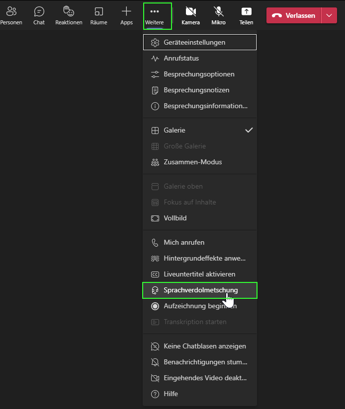 4a. Falls die Meeting-Teilnehmenden dies nicht direkt auswählen, haben sie die Möglichkeit via «…Weitere» auf die Funktion «Sprachverdolmetschung» zuzugreifen.